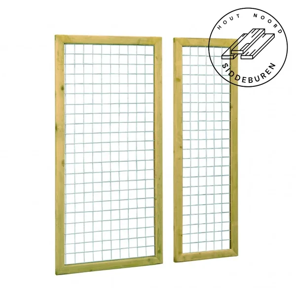 Betonijzertrellis met verzinkt betonijzer en een grenen raamwerk van 4,5 x 7 cm. Het betonijzer heeft een maaswijdte van 7,5 x 7,5 cm en doorsnede van ø 5 mm. Het grenen raamwerk is groen geïmpregneerd.